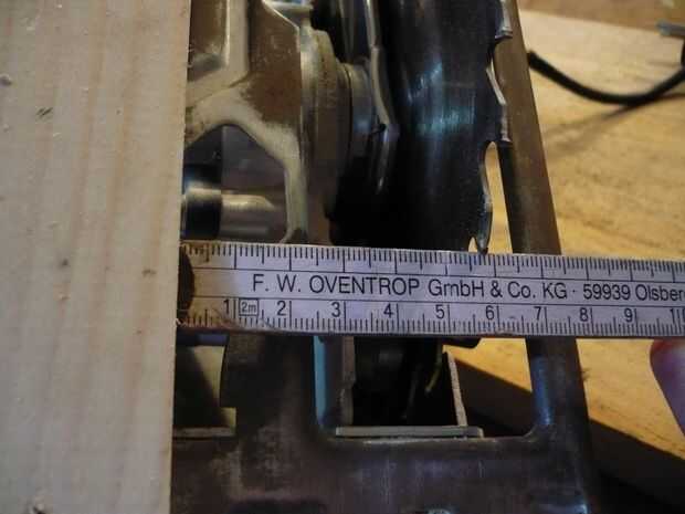 Use un metro (cinta métrica) para medir la distancia entre la cuchilla y la guía de madera. Necesitamos 5,6 cm (2,2 pulgadas). Esa distancia debe ser igual en ambos lados de la hoja para que la sierra puede cortar recta. Para asegurar a la guía, conectar a una base con los tornillos de la sierra y comprobar una vez más distancia - cuadro 3.