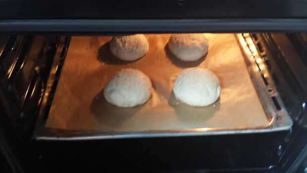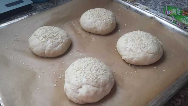 Después de una hora la masa debe haber doblado en tamaño. Amasar durante unos minutos y dividir en 4 bolas. Ponerlos en una placa para horno con papel de hornear. Cubrir con una n y deje que se suba un poco más durante unos 15 minutos. Precalentar el horno a 190 grados C (327 grados F). Mezcla una CDA de agua con una CDA de leche. Borrón de transferencia de un poco de esto en los bollos. Primero retire la toalla porsupuesto. Tapar los bollos con semillas de sésamo y em meter en el horno. Dejarlos cocer durante unos 15 a 20 minutos.