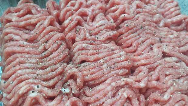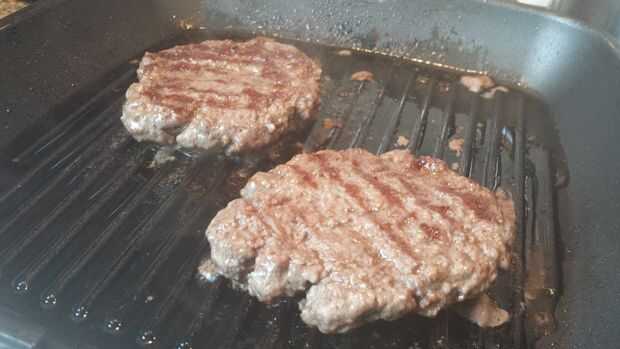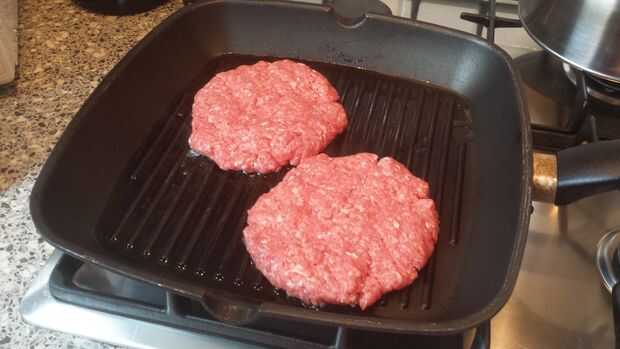 Ahora es el momento para la empanada. Condimentar que la carne picada con sal y pimienta. Haga 4 hamburguesas fuera de él. Calentar un poco aceite de oliva en una cacerola de la parrilla y cocer al horno las hamburguesas. También puede utilizar una cazuela normal o una parrilla de contacto. No importa, mientras se hornea la carne! Mientras tanto, picar la cebolla y los pepinillos.