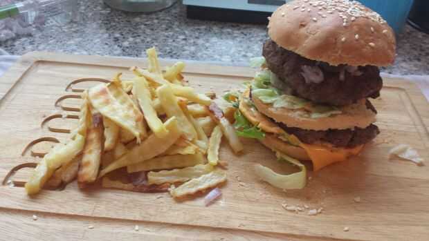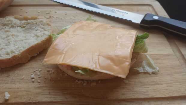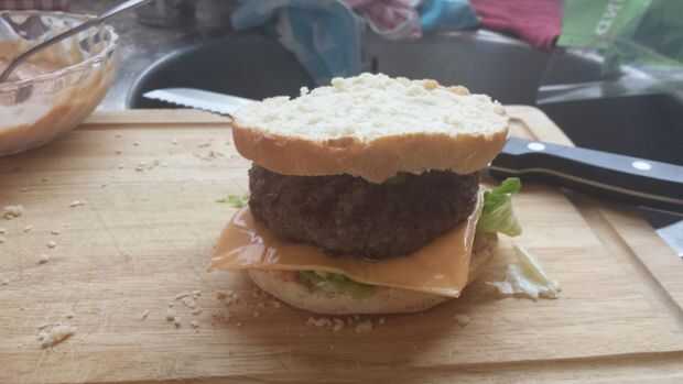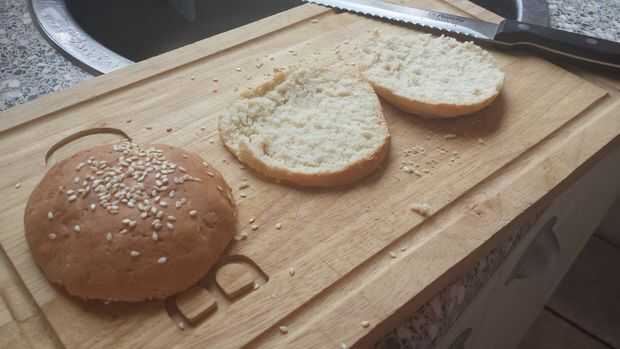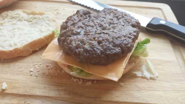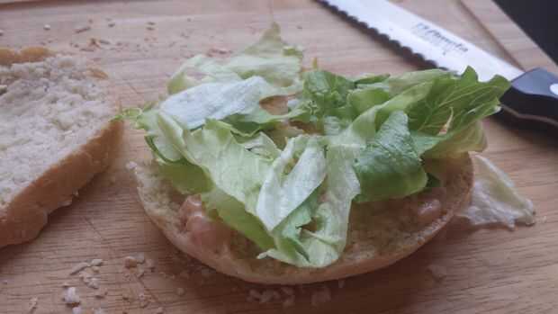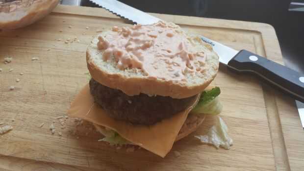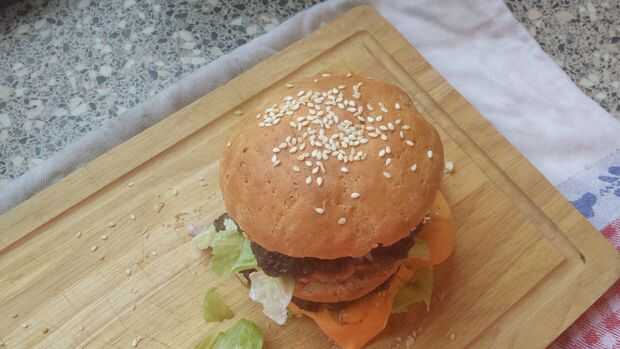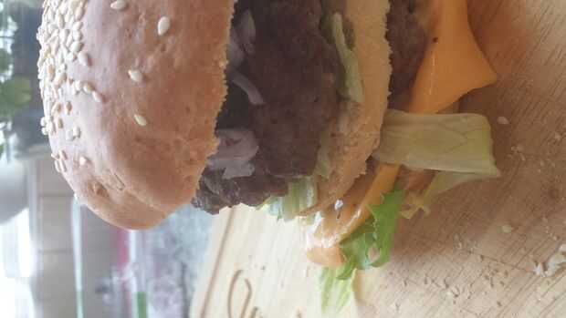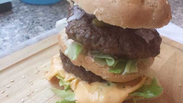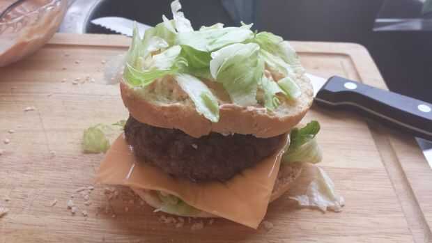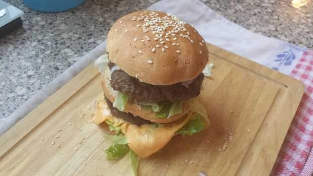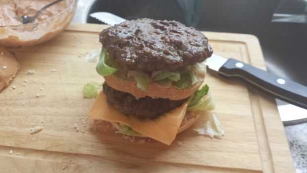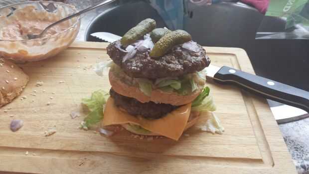 Divide a bun in three pieces. En la pieza inferior se iniciar con un poco de salsa. Luego añades un poco de lechuga. Además de eso pones una rebanada de queso cheddar. A continuación agregue una empanada. Algunos cebolla y pepinillo de eso y añadir el pan medio. En el pan medio empiezas con otra capa de salsa. Después de eso viene la lechuga. Luego agregue otra patty y top con cebolla y pepinillos. Terminar con moño superior. Se hace! Parece un Big Mac y también sabe como. La única diferencia es que éste sabe mucho más fresco y es un poco menos graso. Maravilloso!
