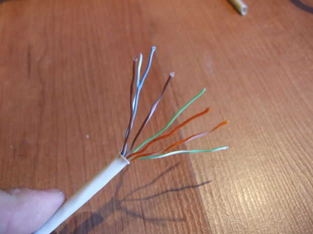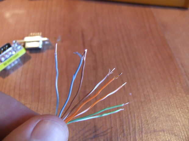 Para hacer la vida un poco más fácil, tira de aproximadamente una pulgada del aislamiento externo CAT5. Y he aquí: 8 alambres preciosos en colores bonitos. Asegúrese de que usted tira de unos 2/3 mm del aislamiento del cable interno. Intente usar un pelacables. Uso mis dientes porque Macgyver hace demasiado. No hacerla larga como pudiera atajo cuando trasteo todos los cables en el conector VGA.