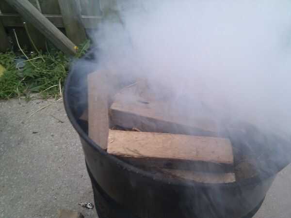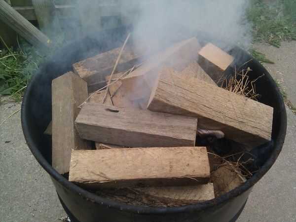 Después de agregar toda la madera, deje que el fuego arda hasta que toda la madera del barril está en llamas. Este es un paso importante porque va a quitar todo el gas de madera de esta manera. Su leña y usted comenzará a ver al char en el exterior de la madera.