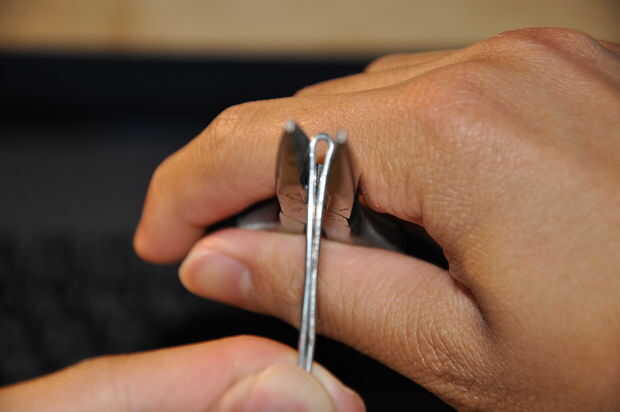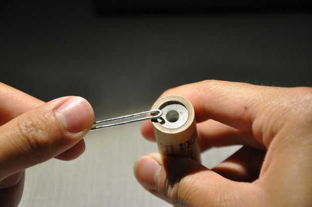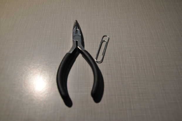 Me preocupaba un poco el motor no está en su lugar, así que formé un clip de retención utilizando un clip de papel. Unbent el clip con un par de punta Pinzas así que era un trozo recto de alambre, luego doblé por la mitad. Luego hizo a 90 grados de la curva en el extremo para colgarse el extremo del motor, luego grabó la pieza al lado del cohete. Cuando usted lanza el cohete, usted querrá envolver alguna cinta alrededor del motor y el clip.