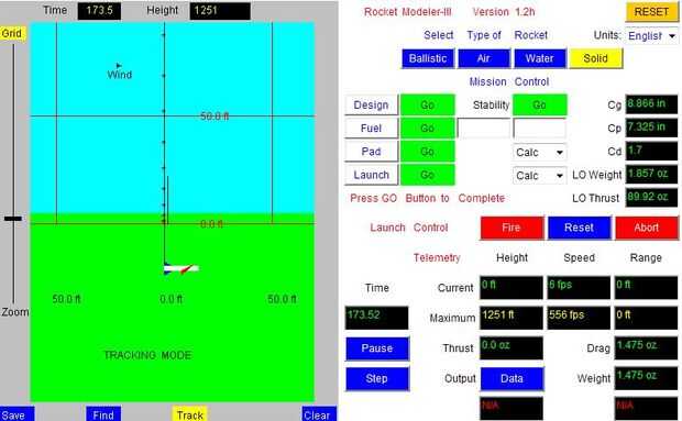 Pulsa el botón "GO" en medio de la página, luego cambie a la página de combustible. Pensando que estaría utilizando un motor más grande, me decidí por un motor de C6-7. Golpe "GO" para la página de combustible y lo mismo para la página de "Pad". En la página de "Lanzamiento", golpe "Fuego", y tendrá la animación de lanzamiento de su cohete. El applet entonces le proporcionará la altura teórica y gráficos de velocidad que el cohete iba a producir. Puede volver y jugar con los ajustes hasta llegar a la altura deseada. Sólo asegúrese de volver a través de cada una de las páginas de diseño, combustible y cojín y pulsa "GO". Por alguna razón que el applet no te permitirá lanzar tu cohete a menos que éste antes de cada lanzamiento.