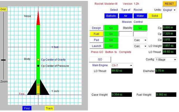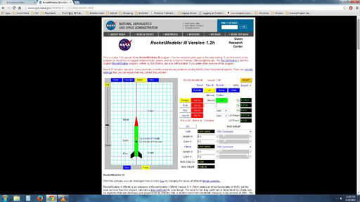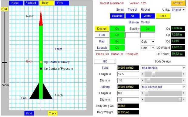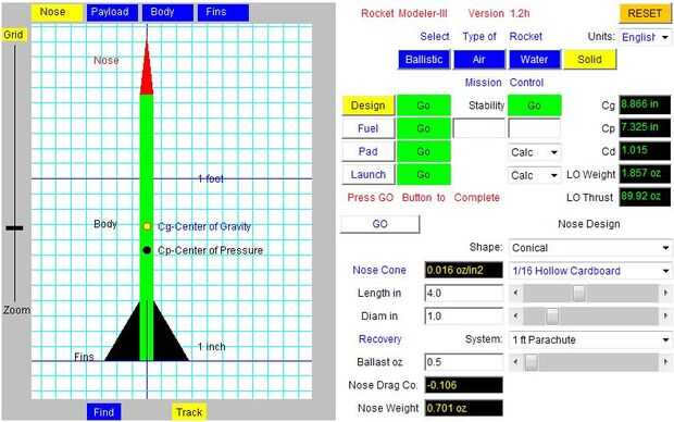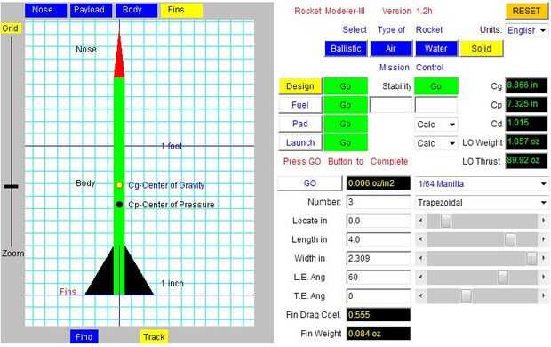 Una vez que RocketModeler para arriba y funcionando, necesita seleccionar primero la opción de combustible "Sólido" en la esquina superior derecha del applet. A continuación, seguir adelante y empezar a jugar con los ajustes para ver cómo diferentes parámetros cambiar el rendimiento del cohete. Puede cambiar a través de diseño, combustible, almohadilla y lanzar páginas mediante los botones en el centro de la ventana. En la página de diseño, se puede cambiar a través de los menús para los diferentes componentes utilizando las pestañas en la parte superior del cohete esquemática en la parte superior izquierda. La configuración que he utilizado puede verse en las imágenes. Cambiar la longitud de la nariz a 4 pulgadas y cambiar el espesor del cono de cartulina de 1/16 de pulgada para que coincida con las capas de manila doble del cono del cohete. Entonces ha cambiado el sistema de recuperación por paracaídas 1 ft. En la pestaña del cuerpo, (dejé la carga solamente), cambiar el material a manila de 1/64 y aumentó la longitud de 17.5 pulgadas. Por último, en la ficha de aletas cambió el material a manila de 1/64, la Ubique en 0, la longitud a 4 pulgadas, el ángulo de la L.E. (borde delantero) a 60 grados y el ángulo de la T.E. (borde posterior) a 0. El ancho de las aletas automáticamente ajustados a 2.309, dado los parámetros.