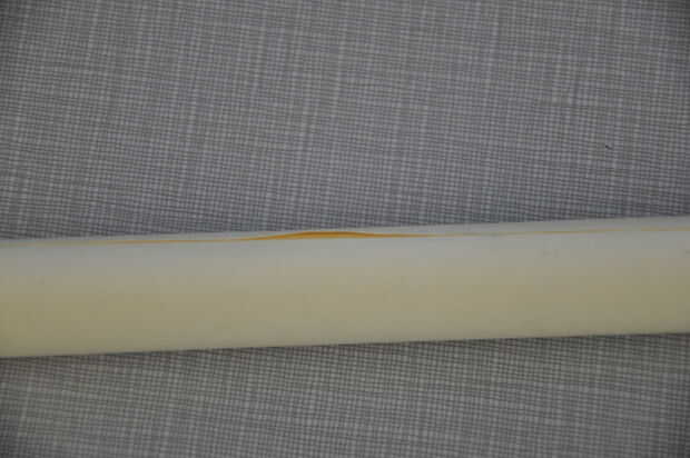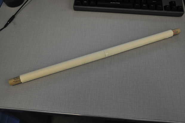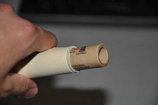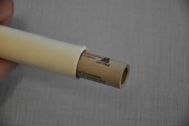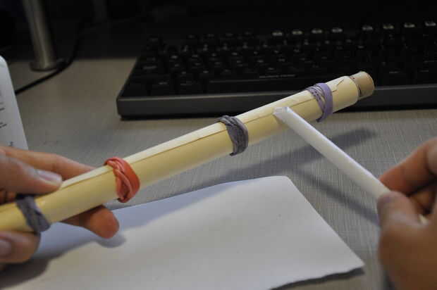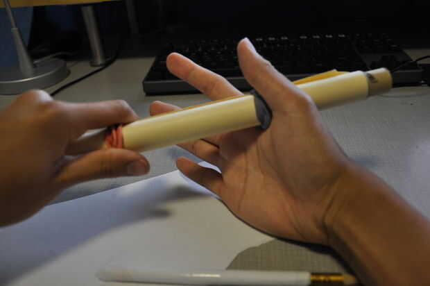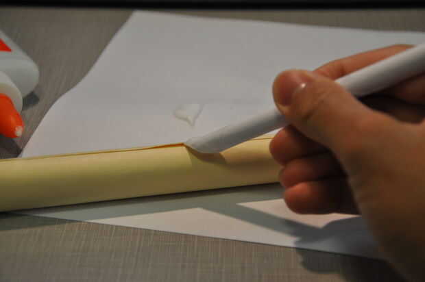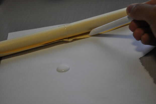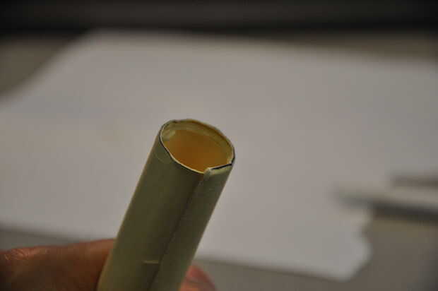 El método que utiliza era iniciar con dos bandas de goma, una en cada extremo del tubo. Otra vez, guardé los motores cohete para asegurar un ajuste apretado. Entonces, solía el pincel pegamento aplique el pegamento un poco a la vez a la aleta de manila. Después pegué un tramo, yo rodé una goma a lo largo del tubo y comenzó a pegar la siguiente sección, avanza por el tubo hasta que la cosa entera fue hecha. Después de dejarlo secar durante la noche, había unos huecos aquí y allá donde el manila no era totalmente pegado abajo. Utilicé el pincel pegamento y un poco de presión para pegar en el lugar. Si no pegar el tubo exactamente uniforme, habrá una parte que se ajusta el motor espacial mejor que el otro. Marcar este lado como la parte inferior del cohete y el otro lado de la parte superior.