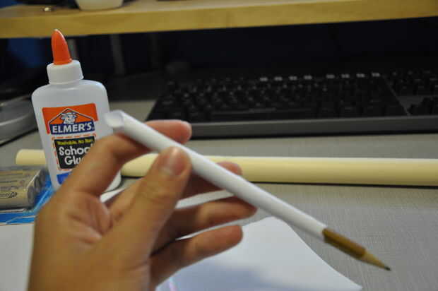 Si usted no podría encontrar un pequeño, cheapo cepillo utilizar, podría hacer un pincel como yo lo hice. Para hacer que el cepillo, me arrancó un pedazo de la esquina de una hoja de papel y había cubierta la esquina con cinta Scotch. Esto es para que la punta no se romperá aparte de ser impregnado con pegamento. Entonces me lió el pedazo de papel alrededor de un lápiz para que la esquina cuelga el extremo del lápiz. Puedes ver en la imagen que los formularios en papel a cualquier superficie se pulsa, lo que es ideal para aplicar pegamento.