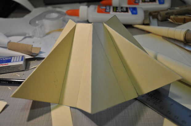 Usted puede ver en las fotos que originalmente intentado hacer las aletas de una sola pieza, pero terminé misjudging la distancia entre las aletas y la pieza fue irregular cuando se envuelve alrededor del tubo del cuerpo. Que terminé tener que cortar cada una de las aletas de forma individual. Incluso si hubiera medido correctamente, pegado habría sido una pesadilla con la pieza grande, difícil de manejar. Corte en las tres aletas individuales fue mucho más fácil.