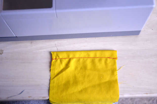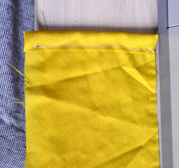 5. cosa 1/4" desde el borde de la tela, no en el pliegue. Asegúrese de que dejar espacio suficiente para deslizar el hilo por la parte superior de la tela. Ver fotos para tener una idea de lo que debe parecer cuando haya terminado.
