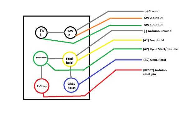 Antes de excavar en un proyecto, es bueno averiguar un plan. Hice un pequeño boceto rápido de MSpaint para mostrar cómo quería mi diseño de botón y configurar mi cableado. Básicamente, mi ciclo Inicio Feed Hold, Reset y parada de botones compartir el cable de tierra (-) de Arduino. Los dos interruptores será en su propio circuito ya que realmente no sé lo que quiero usarlos para. Todo va a empate en mi bloque de terminales antes de salir vía el conector serial. Hay conectores probablemente mejores que un conector serial, pero Sparkfun tenía algunos tapones poco cool y eran más baratos que otras opciones que he encontrado.
