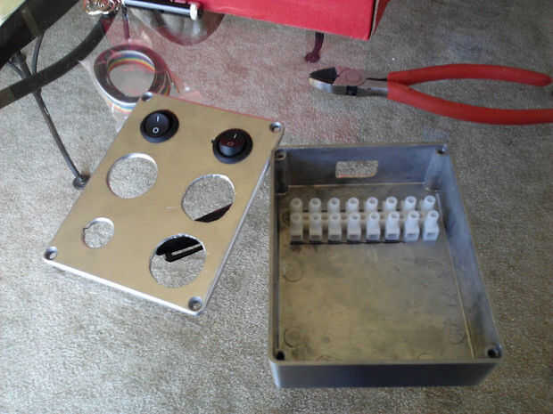 Una vez que me di cuenta que quería todo, usé mi paso taladro para perforar algunos agujeros algunos grandes. 1-1/4" para ser exactos, mi taladro luchado realmente, así que ten cuidado! Una vez que los agujeros fueron perforados, he probado el ajuste de los botones (para asegurarse de que no eran demasiado altos) y la ubicación de mi bloque de terminales. Cuando estaba seguro de que todo estaba en un buen lugar, pegado en el bloque terminal y me fui a soldar...