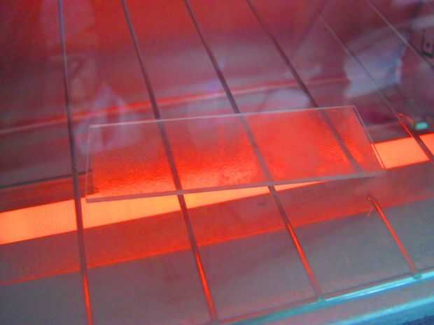 Ahora tiran que lechón en el horno. EVA se funde a 80 grados C, y su horno conseguirá mucho más que eso. Usted puede decir cuando se funda, porque resulta perfectamente transparente. EVA es índice comparable al vidrio, lo que significa que cuando el plástico es empujado derecho contra el vidrio, la luz pasará por tanto de ellos como si fueran un material. Tan pronto como la EVA se vuelve transparente, apagar la tostadora y saque con cuidado su emparedado. Dejar enfriar y luego pop los clips.
