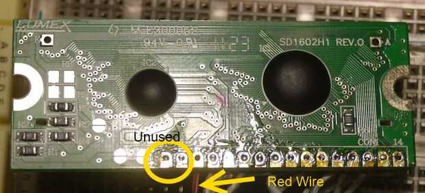 Comienzo con el rojo en el pin uno (ver foto). Hay 16 pernos pero sólo 14 están conectadas a la Junta. 15 y 16 se usan en esta particular pantalla de LCD.