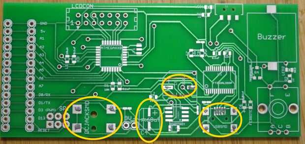 Esta placa necesita dos pasadas con la pasta de soldadura. Grandes componentes toman mucho más tiempo para absorber suficiente calor a la soldadura. Es más fácil hacerlas primero y luego volver para las pequeñas cosas en un segundo paso.