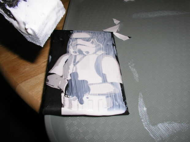 Vuelta la placa para que pueda ver el frente. Aplicar una capa gruesa agradable de Mod Podge por toda la superficie. Una vez que se cubre la imagen, utilice sus dedos deslizan sobre la superficie de la imagen y trabajar cualquier burbuja de aire debajo. Volver a utilizar el cepillo y alisa la capa de Mod Podge. La perfección no es necesaria, Mod Podge es muy indulgente y se puede tocar para arriba durante la segunda capa. No manipular demasiado la imagen y trabajar con rapidez para no empezar el Mod Podge secado en usted.