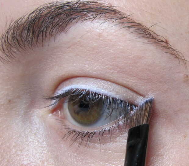 Línea de tu ojo con delineador blanco. Si usted decide hacer un ala, una manera fácil de crear uno es ángulo del pincel desde el extremo de la línea de pestañas inferior hasta el final de tu ceja, luego conecte el ala con el resto del delineador de ojos. Ahora usted puede controlar cómo grueso quieres tu delineador de ojos que.