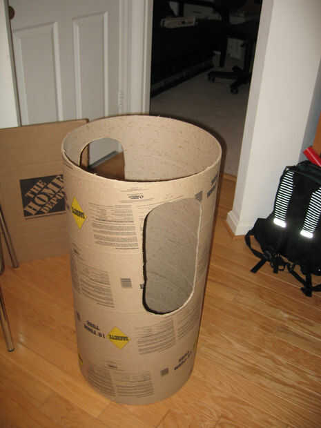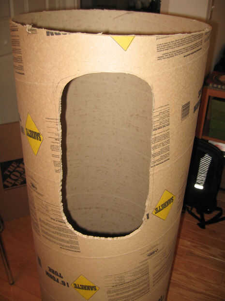 hice una rápida comprobación para asegurarse de que realmente encajo en el tubo de cartón de forma (Consejo rápido: hacer esto con un amigo - no quiere atascarse en una de esas cosas).  Usé un CD para medir a un conjunto de buen tamaño agujeros en los lados de mis brazos.  Comencé hacia fuera en aproximadamente 1,5 CD de ancho y 2 CD de largo, aunque terminé haciendo los orificios finales un poco más grande.