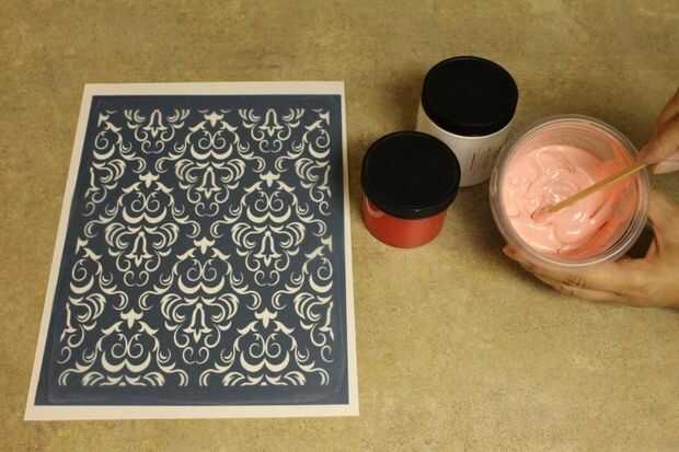 Hacer la plantilla según la instrucción de EZScreenPrint. Tengo otro tutorial en la fabricación de la plantilla si usted necesita ayuda. Una vez completada la plantilla, se mezclan tintas de rojo y blancas de Speedball para hacer el deseado color rosa.