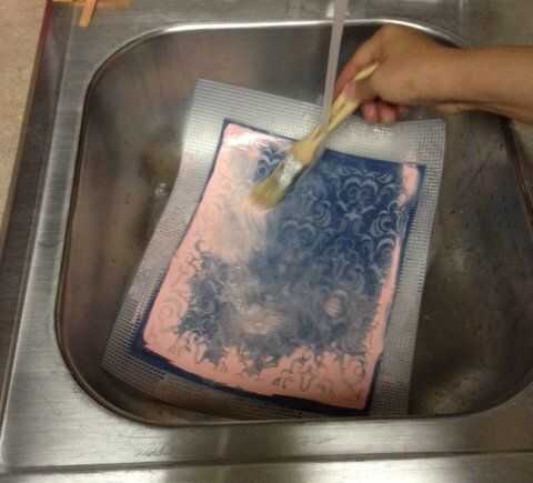 Si haces impresiones múltiples, usted puede establecer la plantilla en el siguiente papel de color de agua, o lavar apagado de la pantalla con agua usando una lona plástica. Asegúrese de que usted no espere demasiado tiempo o la tinta será obstruir la pantalla. Permite que la tinta completamente seco antes de añadir el segundo diseño. Usando la tinta negra de Speedball, impresión de pantalla del diseño de muebles en la parte superior.