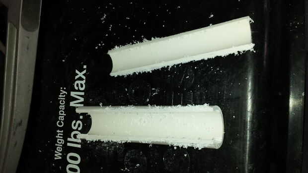 Si fuera sólo para el tubo a la cubierta solar, las cabezas de los tornillos sólo rasgaría a través de la plástica. Incluso con las arandelas, rasgaría todavía probablemente. Así que hice algunos clips que se ajuste sobre la cubierta solar y alrededor del tubo de 1/2". Hice estos de 4-6" largos tramos de tubería de PVC de 1" que han tenido una tira rasgada fuera de ellos la manera larga.