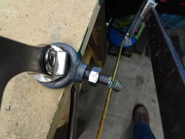 4. Mida la mitad de la longitud de las tuercas de acoplamiento y corte de que pernos de ojo forjado y extremos de barra de lazo abajo con un hack vieron que solo llenan la mitad de la tuerca de acoplamiento. Utilice un archivo para fijar roscas. Deje las tuercas y los extremos montados para que la mitad de la tuerca con el agujero de 5/64" está vacía. (nota que las tuercas marcadas con asterisco sólo caben los extremos de la varilla) (Foto 4)