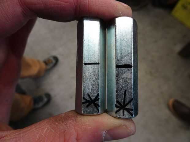1. vamos a empezar con el trabajo del metal primero. Haga una marca en las tuercas de acoplamiento centradas entre ambos extremos (hacer esto en todas las 4 tuercas). Marca dos de las tuercas de acoplamiento para hacerlos diferentes - aquí hemos marcado con una estrella (Foto 1), estos son los que vamos a trabajar con la primera.