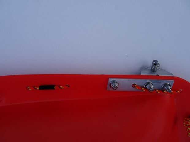 9. taladro una adición 3/8" en el frente y detrás de las esquinas (o utilice ojales de fábrica). Corte el cable de 6mm en dos piezas. Un triple de lazo sobre la mano en el centro de una, se trata de la rotura del frente. Pasar cada extremo de la cuerda de rotura frente a través de estos orificios de esquina y haga tope nudos en los extremos. (Foto 5)