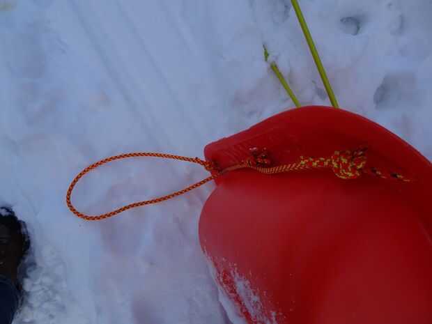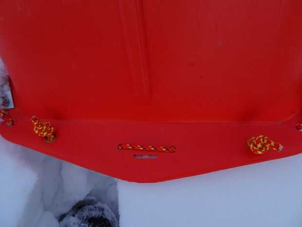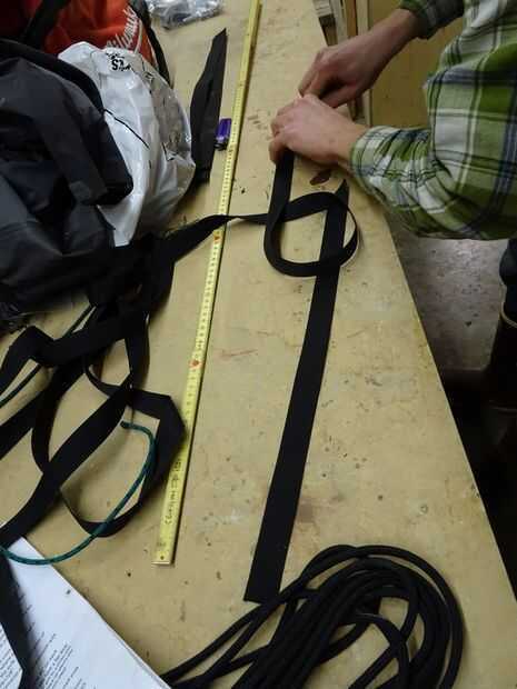 7. a partir de la parte delantera de la pulk, hilo 4 mm cable alrededor de un lado. Al llegar a una ranura de correa, inserte el extremo cosido de una correa y pase lo 4mm a través del lazo antes de volver sobre el labio. Una vez que has completado en parte. Lo hago con el otro los extremos de lo 4mm a centrado en la parte posterior. (Foto 4)