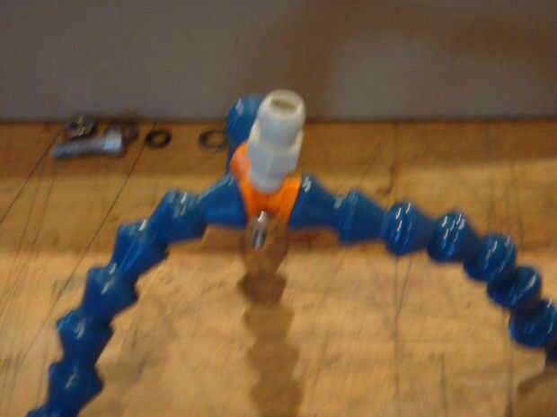 1. Coloque la cabeza de zócalo de 8-32 del perno a través del adaptador como se muestra. Luego poner el perno a través del orificio perforado en el separador de tres vías.