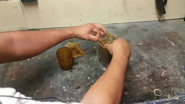 Mientras que es el esfuerzo el pequeño recipiente, coloque una bolsa sobre el lote grande de acetato de hierro. Colocar una banda de goma alrededor de él y almacenar para uso posterior.