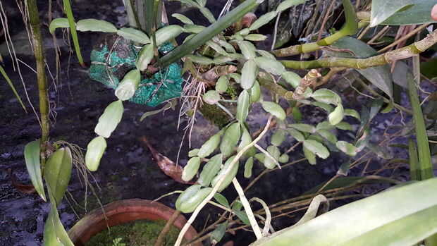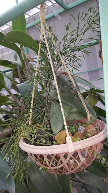• Hay pocas orquídeas colgando de un soporte.