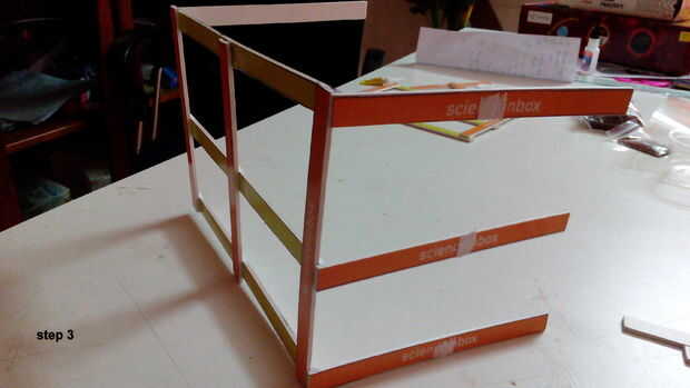 Coloque los tres palos con la pared más larga como se muestra en la foto. Utilizar un pegamento rápido para pegar rápido.
