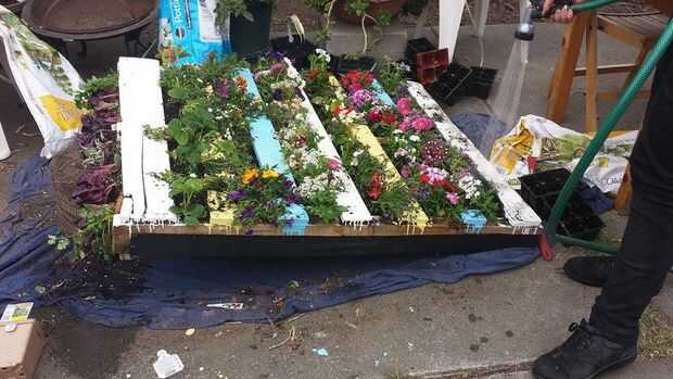 Ahora, empezar a plantar! Poner la capa superior de las plantas (se muestra aquí como la lechuga morada y hierbas) en primer lugar, asegurándose de que las plantas se embalan firmemente al lado de uno.