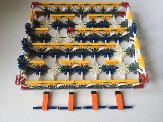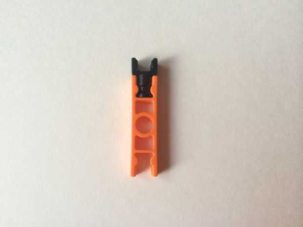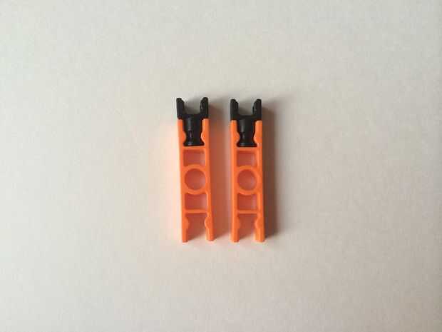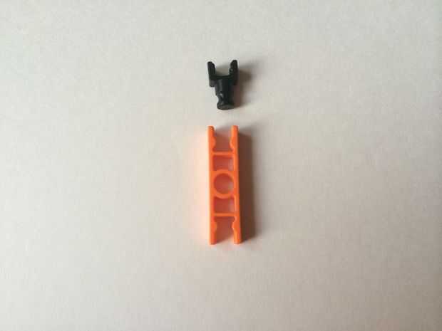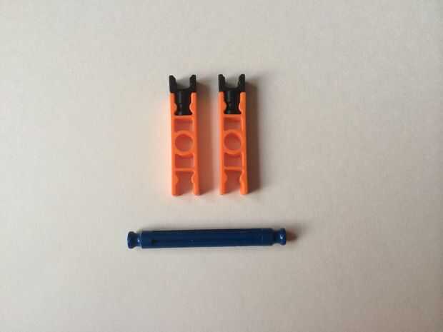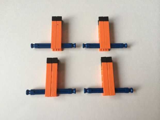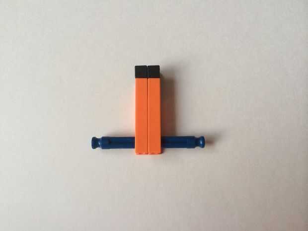 Para construir un bloqueador de la ruta, simplemente conecte un conector en "Y" a un conector naranja, como en fotos 1 y 2. Repita el procedimiento para hacer dos piezas y colocar ambos en una barra azul, como en fotos 3, 4 y 5. Repita el procedimiento para hacer cuatro bloqueadores de ruta de acceso total.