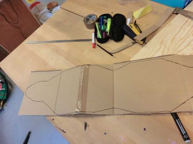 Que empecé a dibujar primero mi mano Junta sobre el cartón utilizando un lápiz y una regla. Para hacer la nariz y la cola de la tabla es bueno usar un objeto redondo para que la apariencia simétrica. Después tuve que hacer llamé sobre las líneas de lápiz con un marcador, por lo que puedo ver las líneas más fácil.