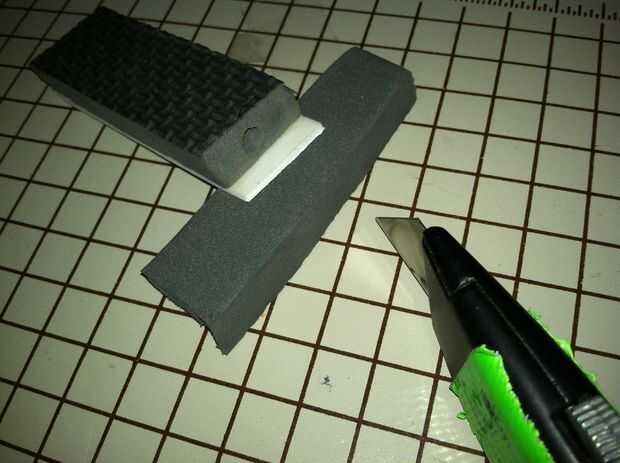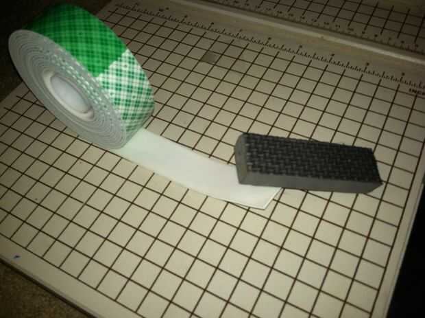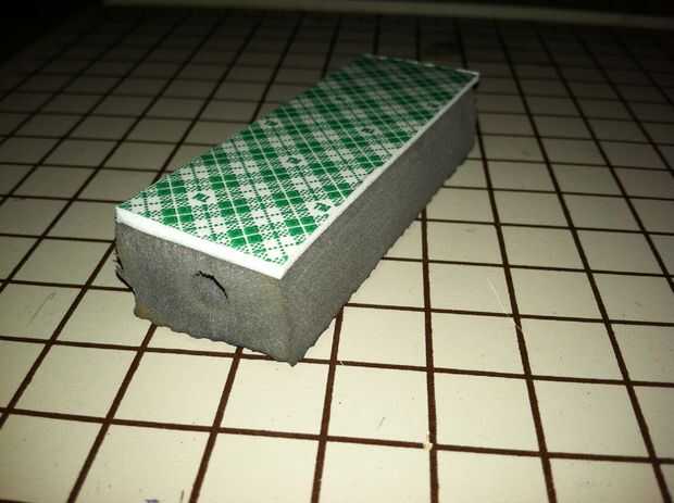 Ahora usted debe tener un 1 "x 3" x 5/8" espuma piezas con un un agujero lateral. Y también cinta de doble cara en un lado.