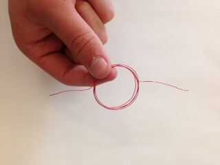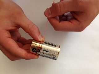 Envuelva el hilo rojo alrededor de la pila varias veces para formar un círculo de alambre. Dejar 1,5 pulgadas en cada extremo del cable que viene de forma perpendicular al círculo; los dos extremos deben ser frente a unos de otros y salen desde el centro de lados opuestos. Asegúrese de que hay una cantidad uniforme de alambre a cada lado para que esté equilibrada. Si no, no funcionará el motor.