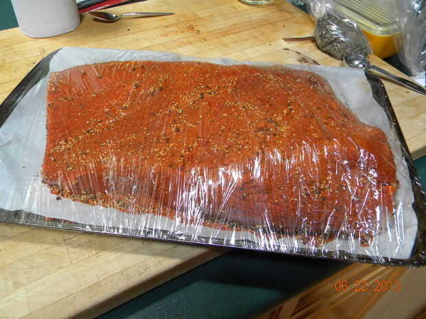 Mezclar bien y frotar en el pecho. Asegúrese de que empuja bastante duro que la frotación se adhieren. Después de ambos lados, cubierta, utiliza abrigo de suran y refrigere de 2 a 3 días dar el tiempo de la carne para absorber todos los sabores.