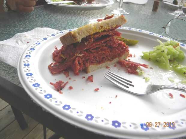 tengo que pedir disculpas por omitir el paso de me corte la carne en la máquina de cortar. Fue en este tiempo nuestros amigos demostradas para arriba y conseguí distraído. Cortar con un cuchillo o utilizar una máquina de cortar, gruesa o fina, nos prefieren delgadas con mostaza un poco de pan de centeno o un bollo de cebolla.
