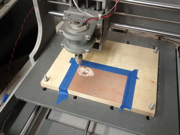La única parte delicada se relaciona con la V en forma de bits. Obviamente, usted querrá grabar la línea más pequeña, más limpia que puedas para montar todos esos diminutos LEDs montaje superficial que ya compraron. Desafortunadamente, la forma de V de la broca va a cambiar el ancho de su corte dependiendo de la profundidad corta en el tablero. Puesto que su acción con cobre no es perfectamente plana son retados a escoger una profundidad de fresado que se limpia huellas todo el tablero.