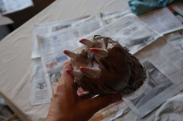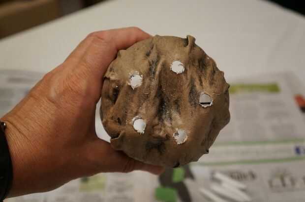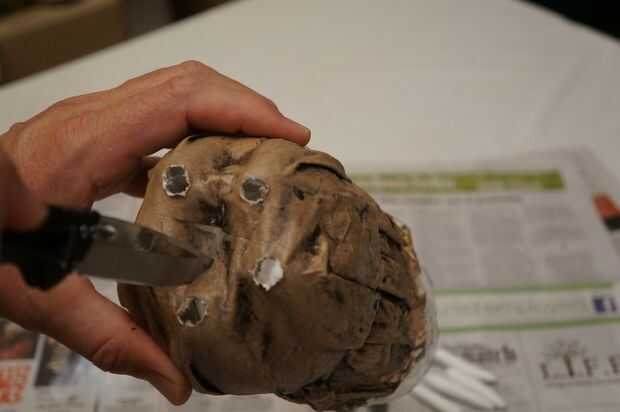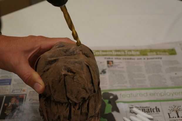 Tomar la boca interior y una broca de tamaño apropiado y cuidadosamente perforar las protuberancias donde van los cinco más pequeños colmillos.