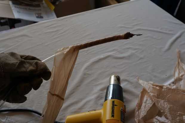 Cortar un par de las bolsas en tiras y empezar a enrollar alrededor de la tubería a partir del extremo del gancho. Calefacción las tiras con la pistola de calor hará que el plástico del encogimiento y palillo a sí mismo. Es probablemente una buena idea usar guantes para no quemarse. Una vez en el otro extremo del tubo de seguir adelante y añadir una segunda capa de tiras de plástico. Que manojo hacia arriba, la arruga y difamar en lugares; usted quisiera que mirara monstruoso!