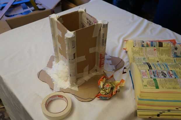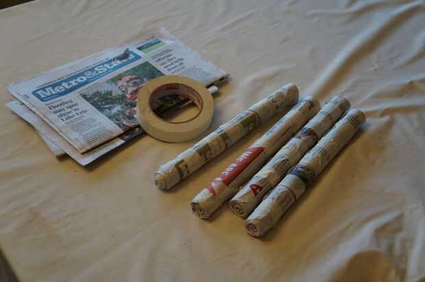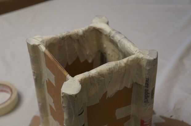 Tome hojas de periódico, hacerlas rodar firmemente en aproximadamente 1" cilindros de diámetro y atar con cinta de enmascarar. Hacer cuatro de estos pilares. Sierra a la altura de las paredes y fijarlas en las esquinas con cinta de enmascarar más.