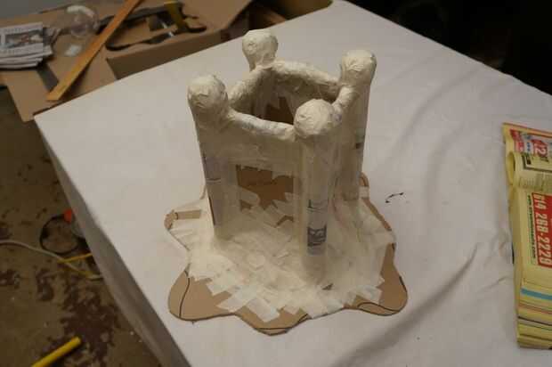 Cinta a la parte superior de los pilares. Serán soportes de fang, cuatro grandes colmillos significa cuatro bolas grandes. Utilizar un montón de cinta adhesiva para fijarlos.