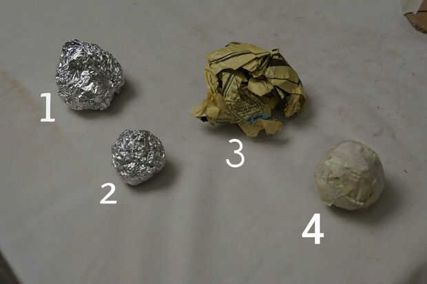 Rodar cuatro bolas de papel de aluminio. Envuélvalas en papel, luego envuelva todo en cinta de enmascarar para que acaben con las cuatro bolas de tamaño pelota de golf.