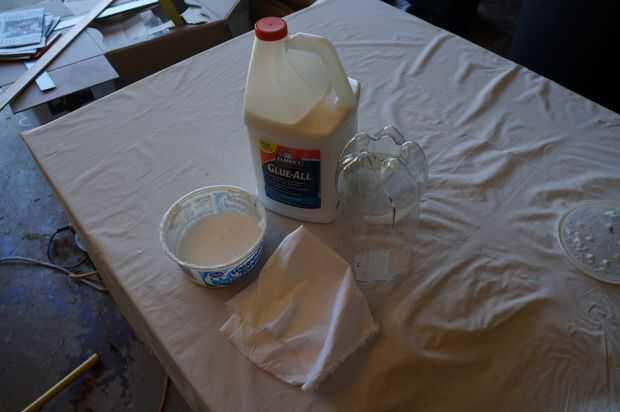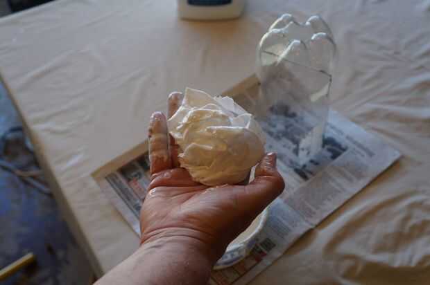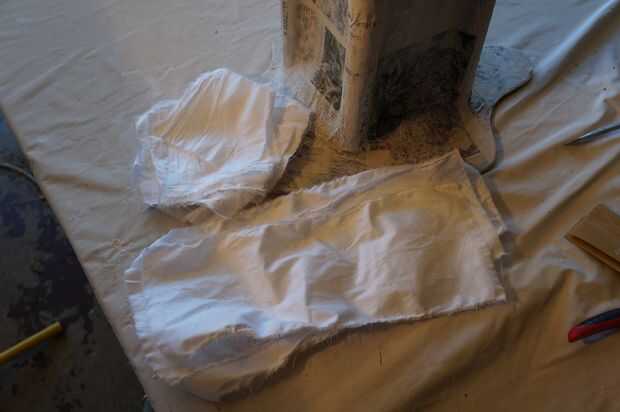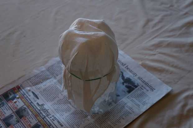 Corte un cuadrado de hoja (cerca de 12 pulgadas de cuadrado) y quitar cualquier hilos sueltos. Empape en pegamento blanco, exprima el exceso y cubra uniformemente sobre el final de "baches" de la botella. Una banda de goma ayudará a mantenerlo en su lugar. Lisa de la hoja de con los dedos y dejar que se seque.