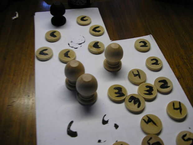 En el otro lado de las monedas, que pintando los símbolos del juego. -para ver estos símbolos y lo que usted está apuntando para, mirar los 4 archivos del PDF en este enlace: http://www.piecepack.org/Printable.html evidentemente, las piezas redondeos iría sobre las monedas en este caso. Debe haber 6 monedas en cada juego, uno para cada uno de los números que sólo pintado. Tenga cuidado de no hacer 2 de la misma moneda!