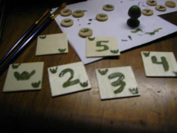 Paso 6 - el juego-lado la pintura de los azulejos. Pintar una versión miniatura del símbolo de juego en la parte superior izquierda e inferior derecho del azulejo y en el centro, colocar el correspondiente número o símbolo. Abajo está mi set para las coronas.