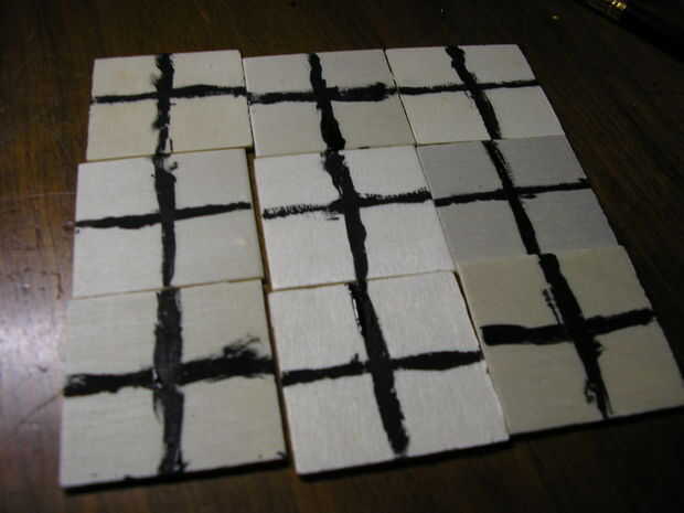 Paso 7 - una vez que los azulejos se han secado, voltearlas. Utilizando cartulina, cortarse una guía y se usa para pintar líneas rectas dividir uniformemente la parte posterior de los azulejos en cuatro secciones. Asegúrese de que estos se realizan en negro, no quiere regalar el traje antes de se voltea! (Para obtener los mejores resultados, una línea de pintura, dejaron secar, luego hacer la línea de cruce).