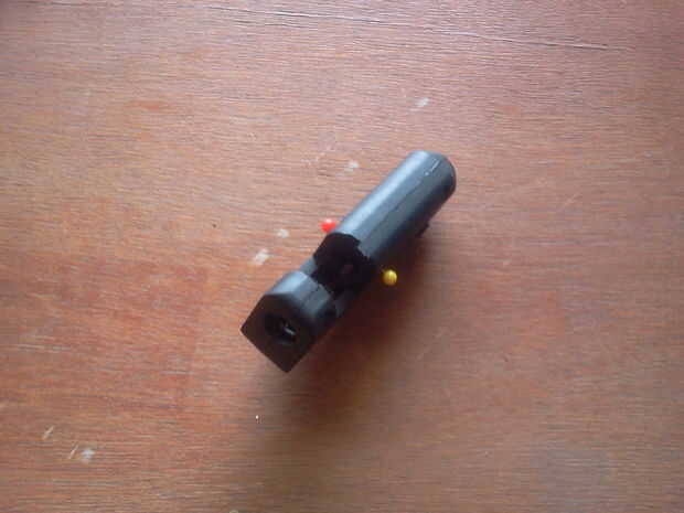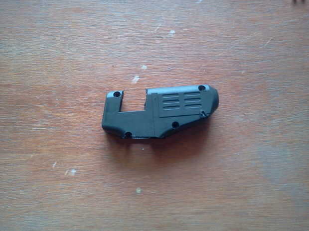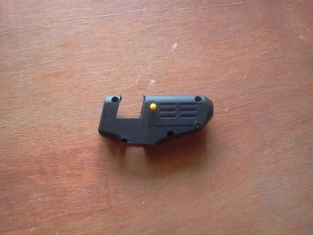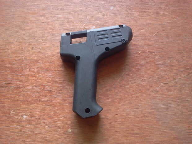 En este paso, pasamos a la caja de arma en un estuche de pluma. Para ello, simplemente corte el mango de la pistola encoladora. También, si hay una pieza plástica en la parte superior del tubo de alimentación, corte.